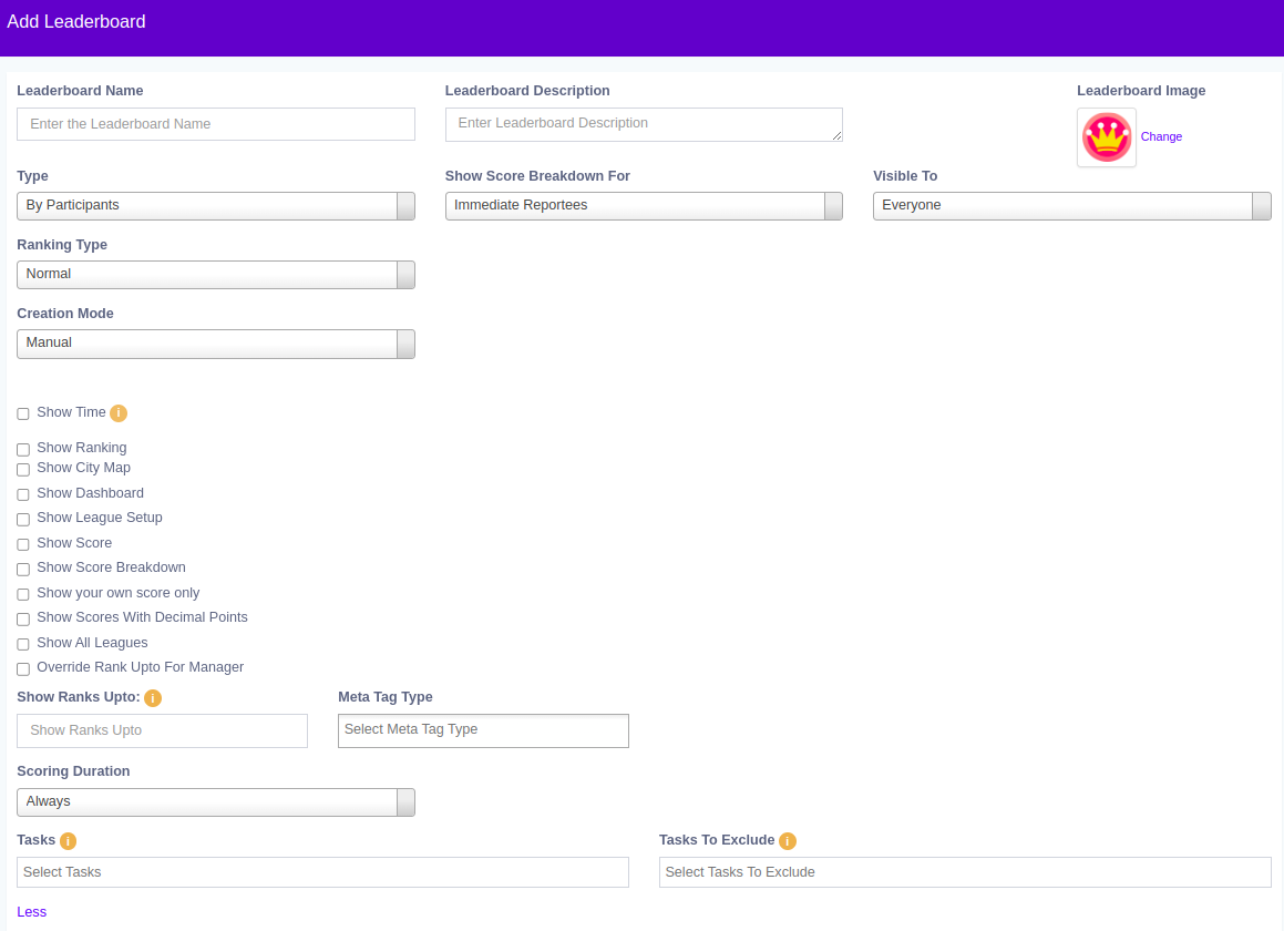 Show Score Breakdown For: This is to restrict the visibility of the leaderboard to the manager, whether they should see all the members, or all their reportees, or the immediate reportees' scores only.