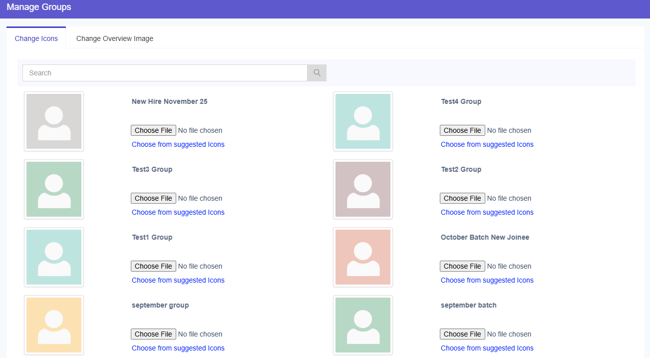 - Manage Groups: It helps you to set the group icon images and cover image of the groups so that they will be reflected in the leaderboards in the user view. Click on Change Icons tab and click on the Choose File to select the file from your system or click on the Choose from suggested Icons to select the icons available in the SmartWinnr system.