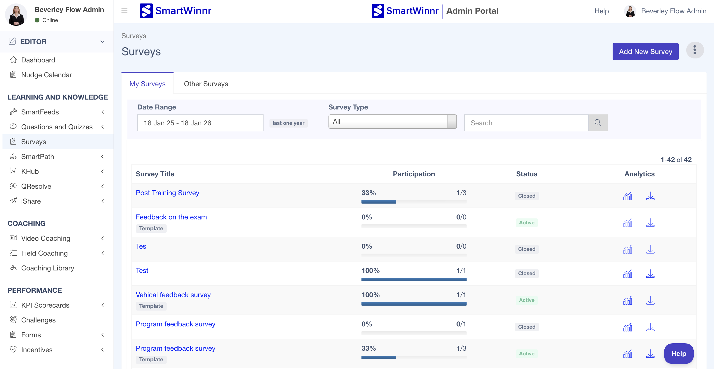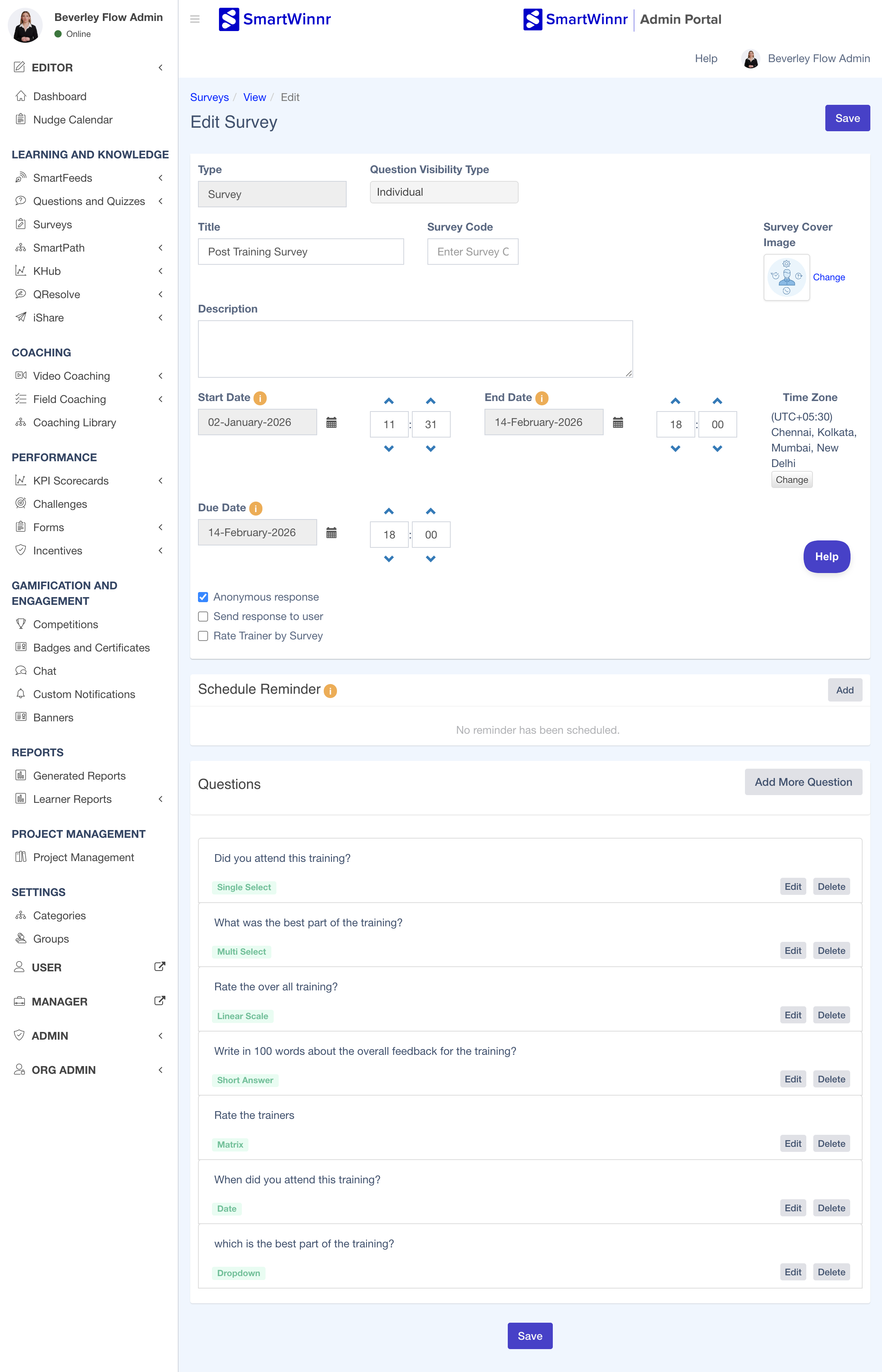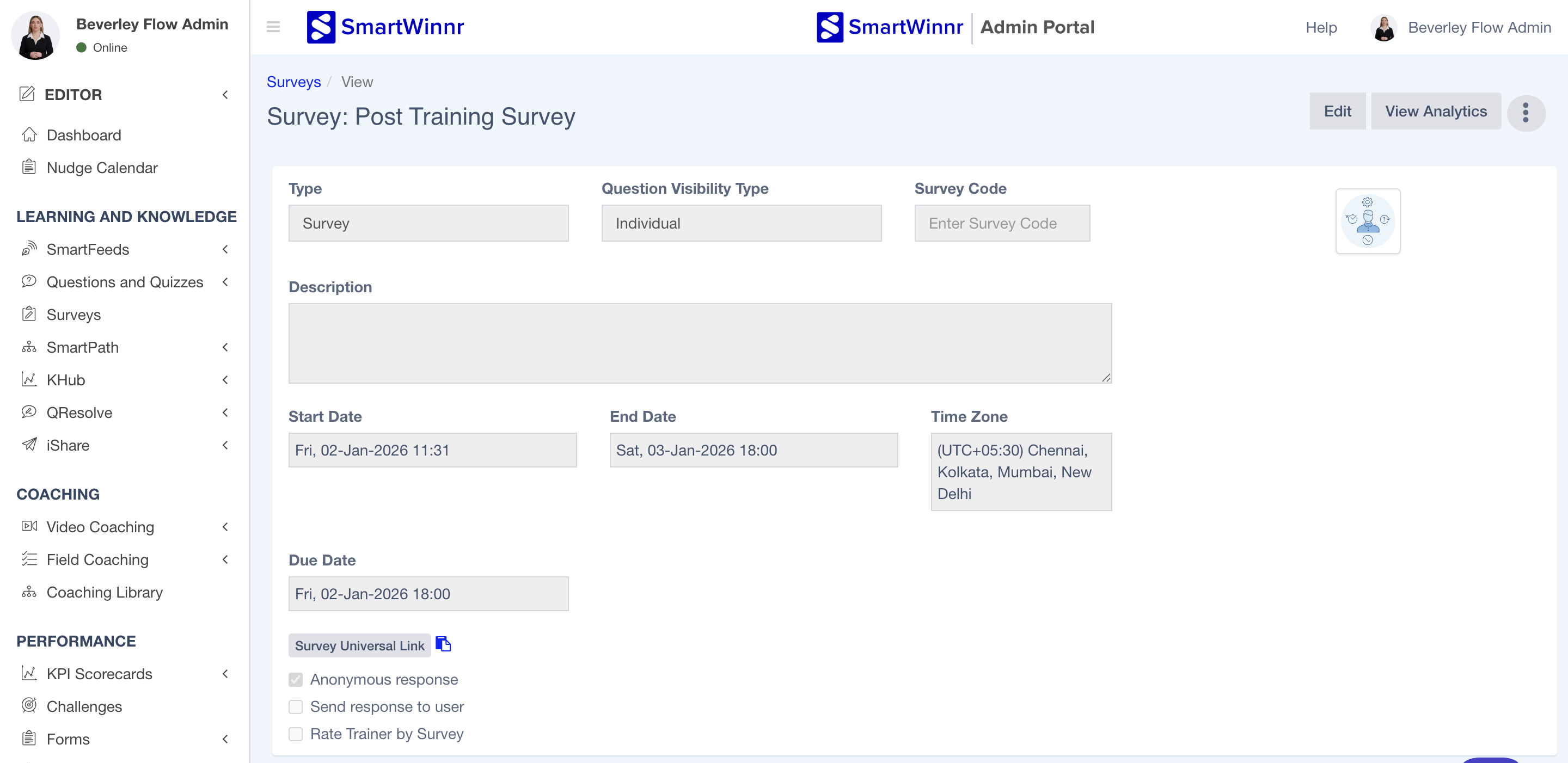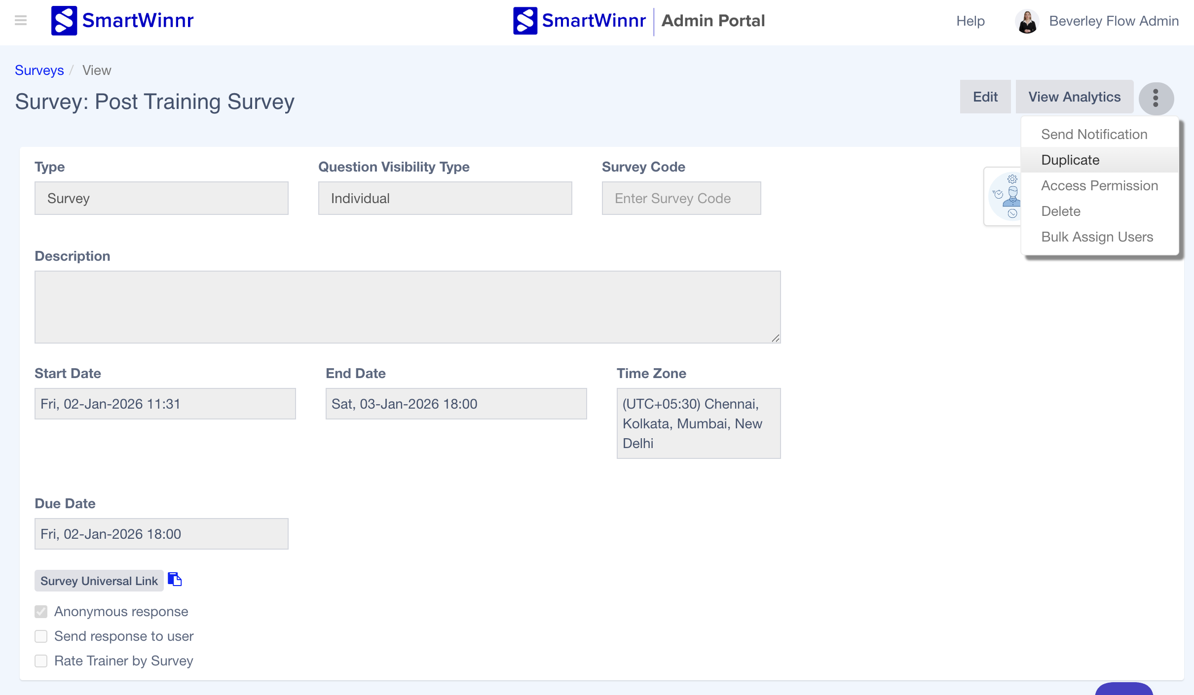 SmartWinnr allows you to duplicate an existing survey so that you can reuse the structure, questions, logic, and settings without having to recreate everything from scratch. This feature helps save time when creating similar surveys for different audiences or periods.