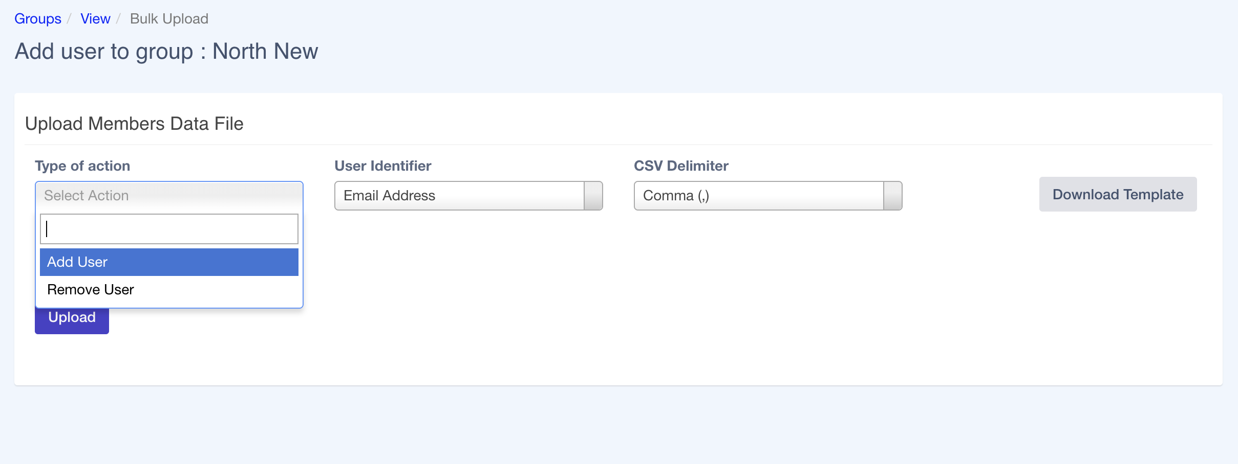There is an Upload Users option available at the top-right corner of the Groups page. Clicking on this button will navigate you to the bulk user upload page.
