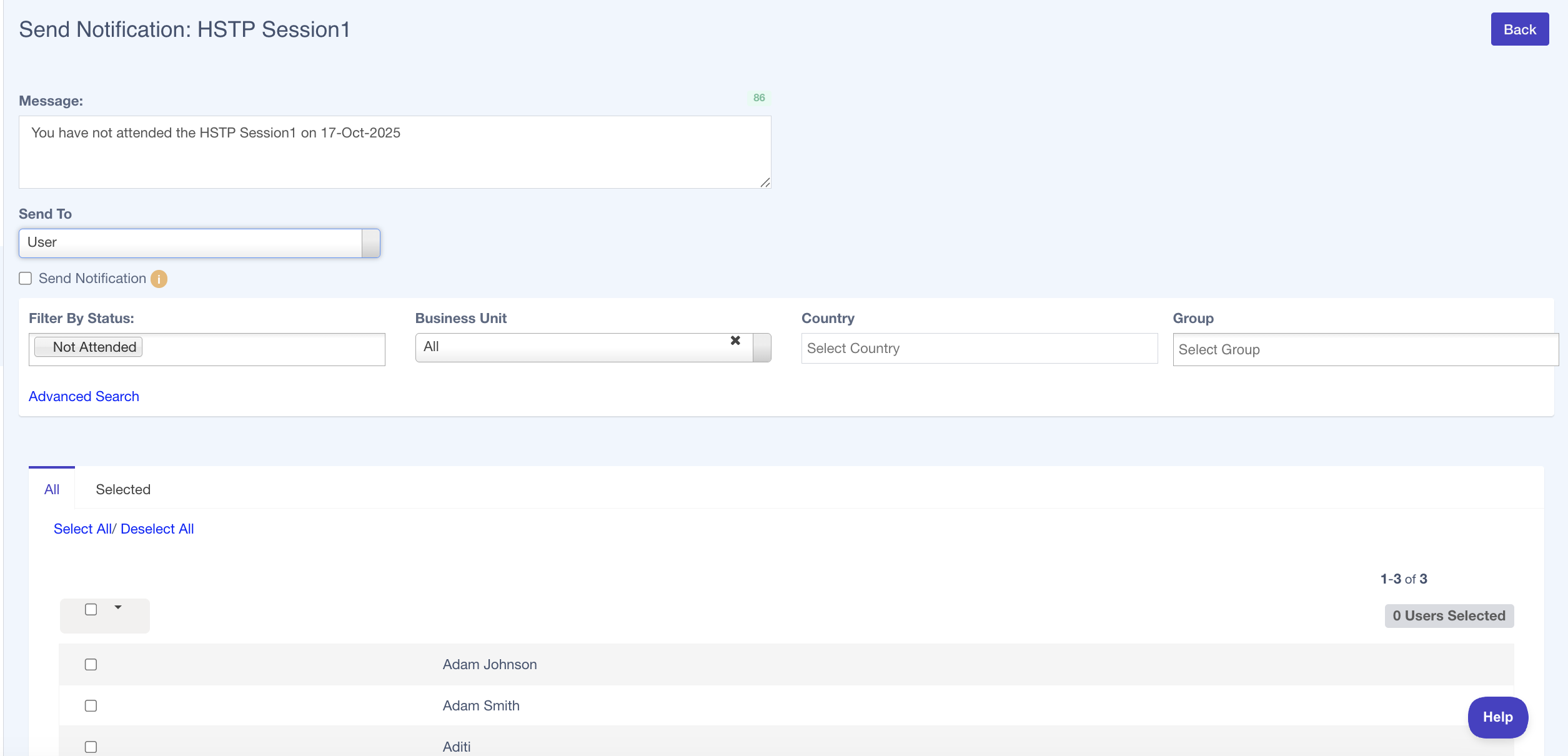 Here, you can customise the notification message and select the intended recipients (user/manager) based on attendance status, who have not attended a session. Once configured, the notification can be sent directly to the selected users.