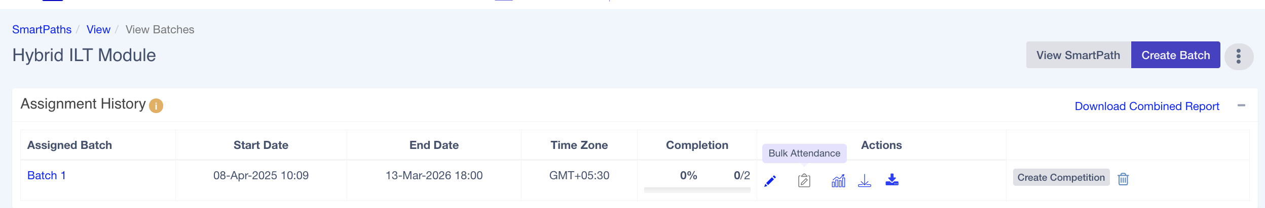 - Here, if there are multiple learning sessions available in selected SmartPath, you can mark attendance of each learning one by one or bulk upload the attendance for multiple sessions together.
