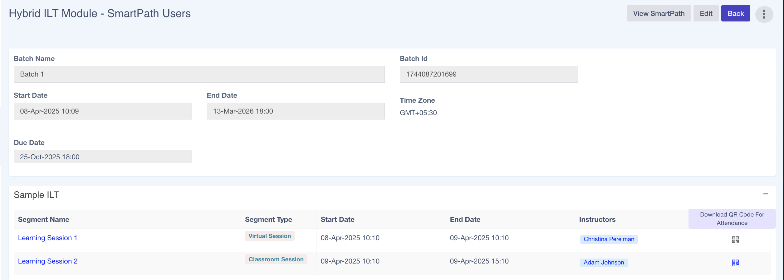 Attendees (learners) can scan the QR code available for the learning session and mark the attendence my themself. The instructor or editor can share the QR code for each session with learners. Learners can scan the QR code using the scanner option available within the SmartPath in User View.