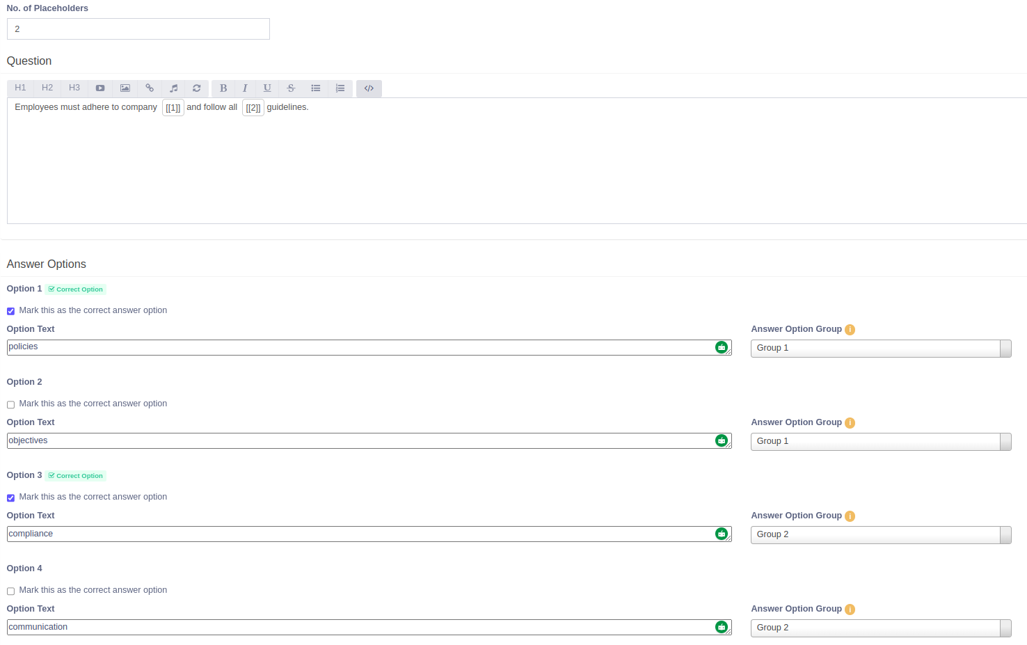 After entering all option texts for each missing word group, select the checkbox “Mark this as the correct answer option” for the appropriate option. This ensures that the system awards the correct score when the user selects the correct answer.