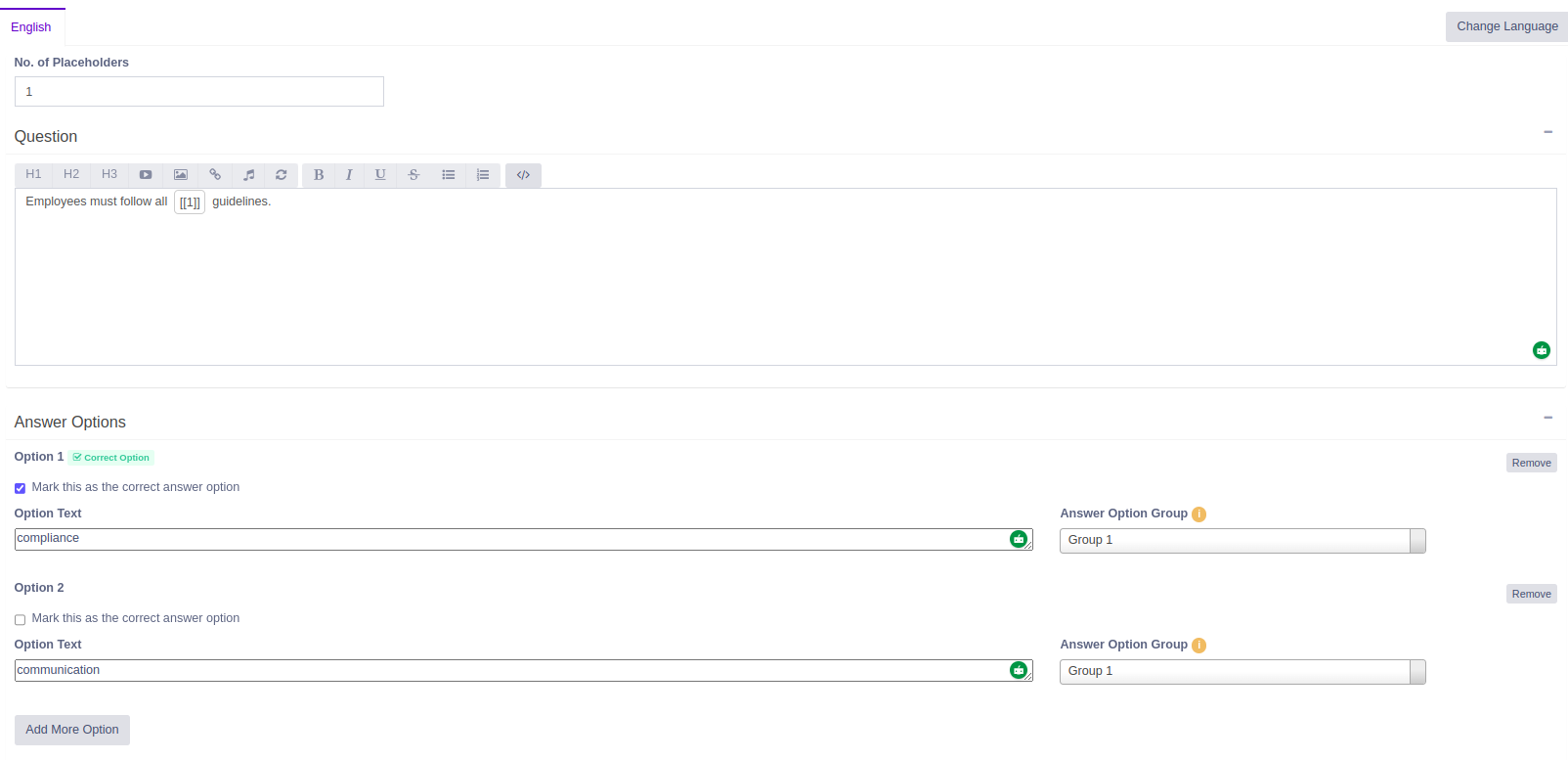 Enter the option texts for each missing word and assign them to the appropriate answer option group. Since this example includes only one missing word, there will be a single answer option group (Group 1). If the question contains two drag and drop words, corresponding answer option groups (Group 1 and Group 2) should be created.