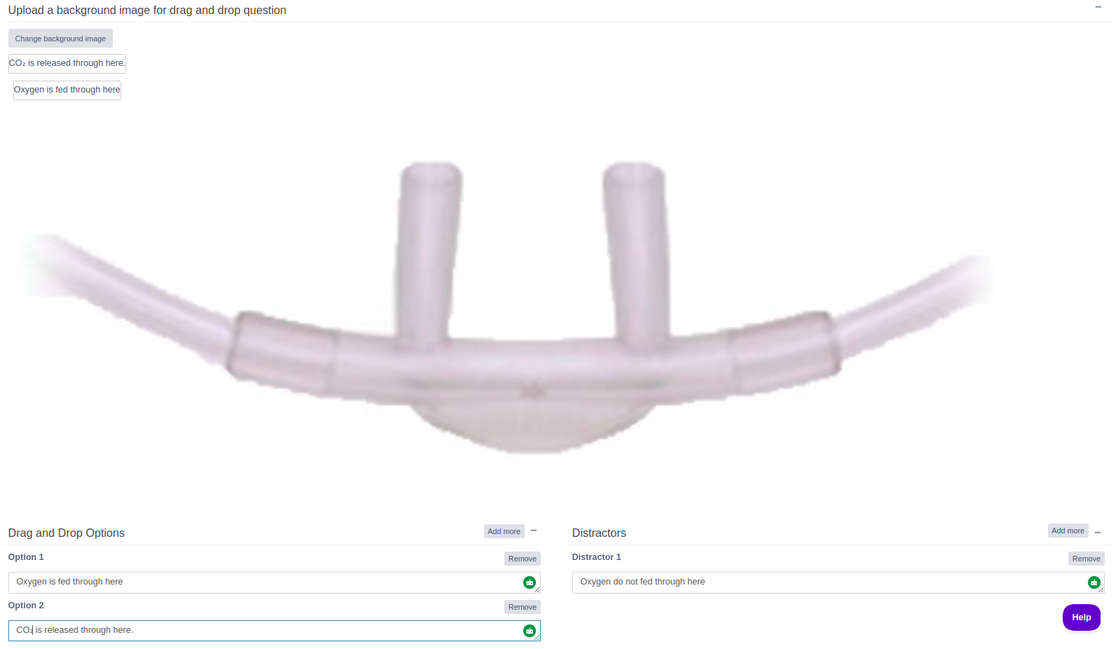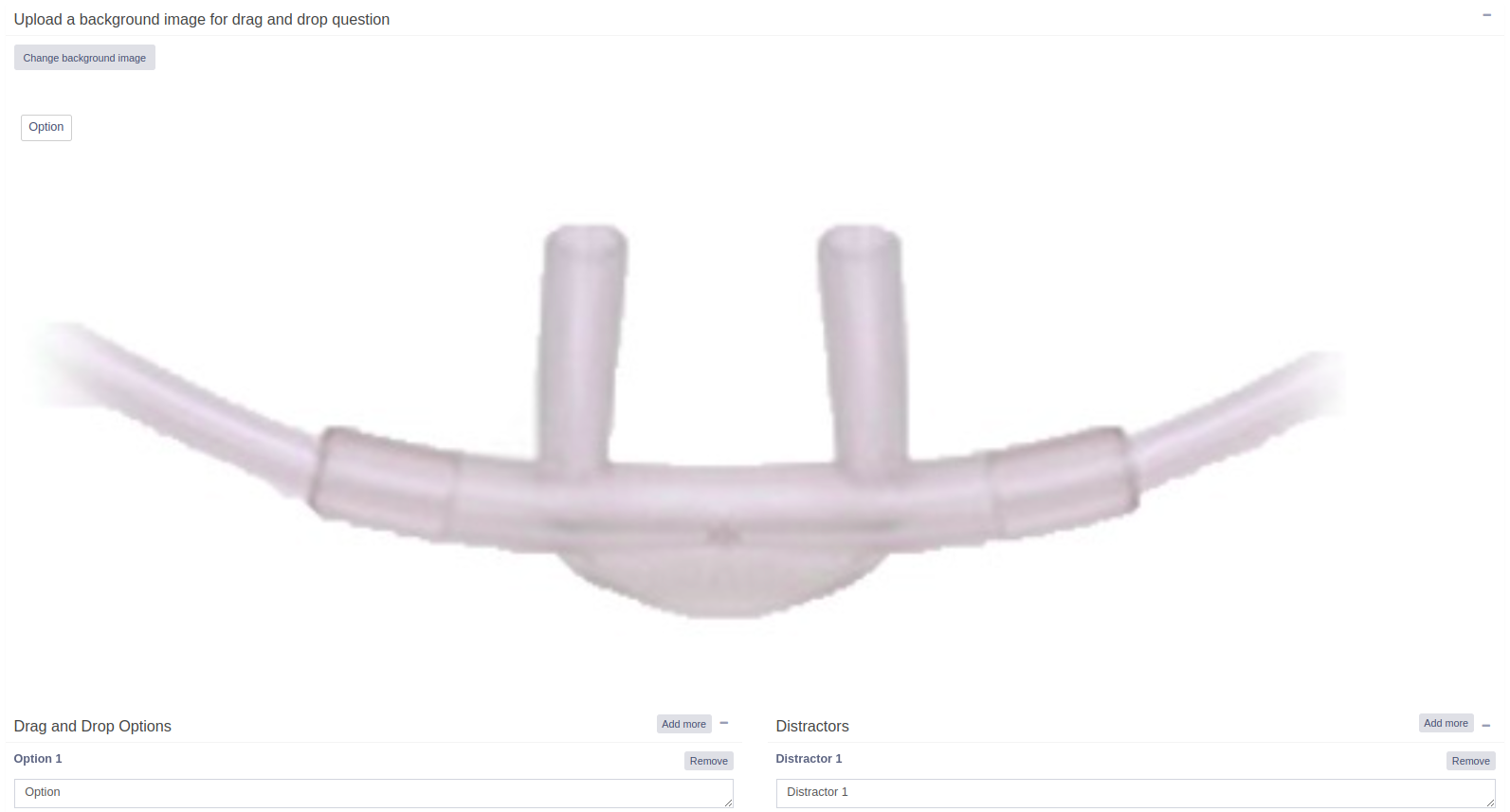 Next, enter the drag-and-drop options and distractors in the corresponding text boxes, as shown in the image above. You can add additional options and distractors by clicking the Add More button. Once completed, the configuration will appear as shown below.