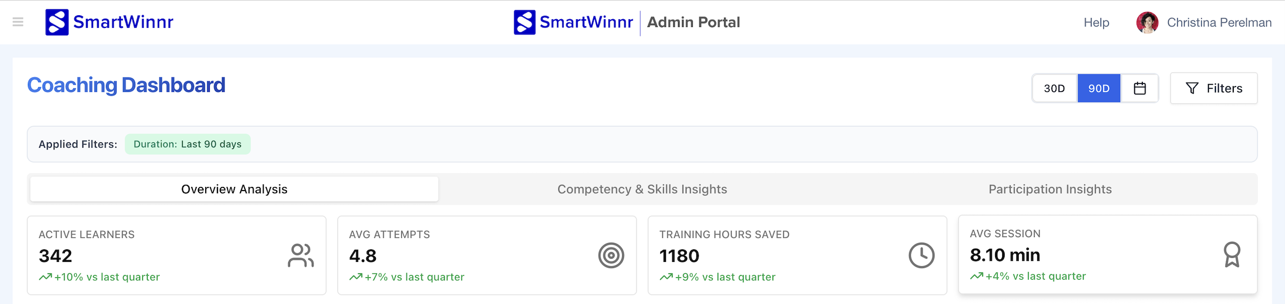 Example: If the metric shows "8.10 min" with "+4% vs last quarter," this means the typical roleplay session lasts 8 minutes and 10 seconds.