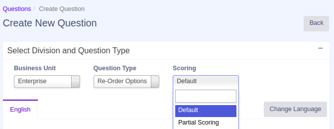 - On the 'Create new Question' select the 'Question Type' as the Re-Order Option. Also, select the scoring, whether default or partial. Use Default Scoring when the question has only one correct answer. Use Partial Scoring when the question has multiple correct answers. In Partial Scoring, the total score is distributed equally among all correct answer options.