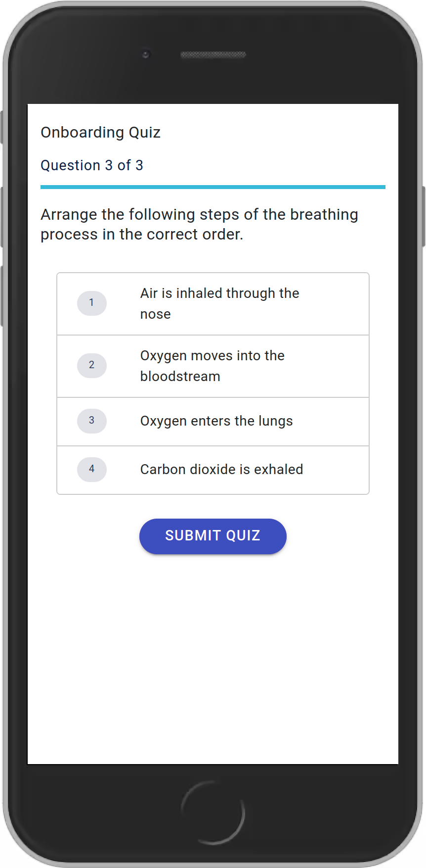 A Re-Order question in SmartWinnr allows participants to drag and arrange answer options into the correct sequence. Learners reorder the items as required and submit their response for evaluation.