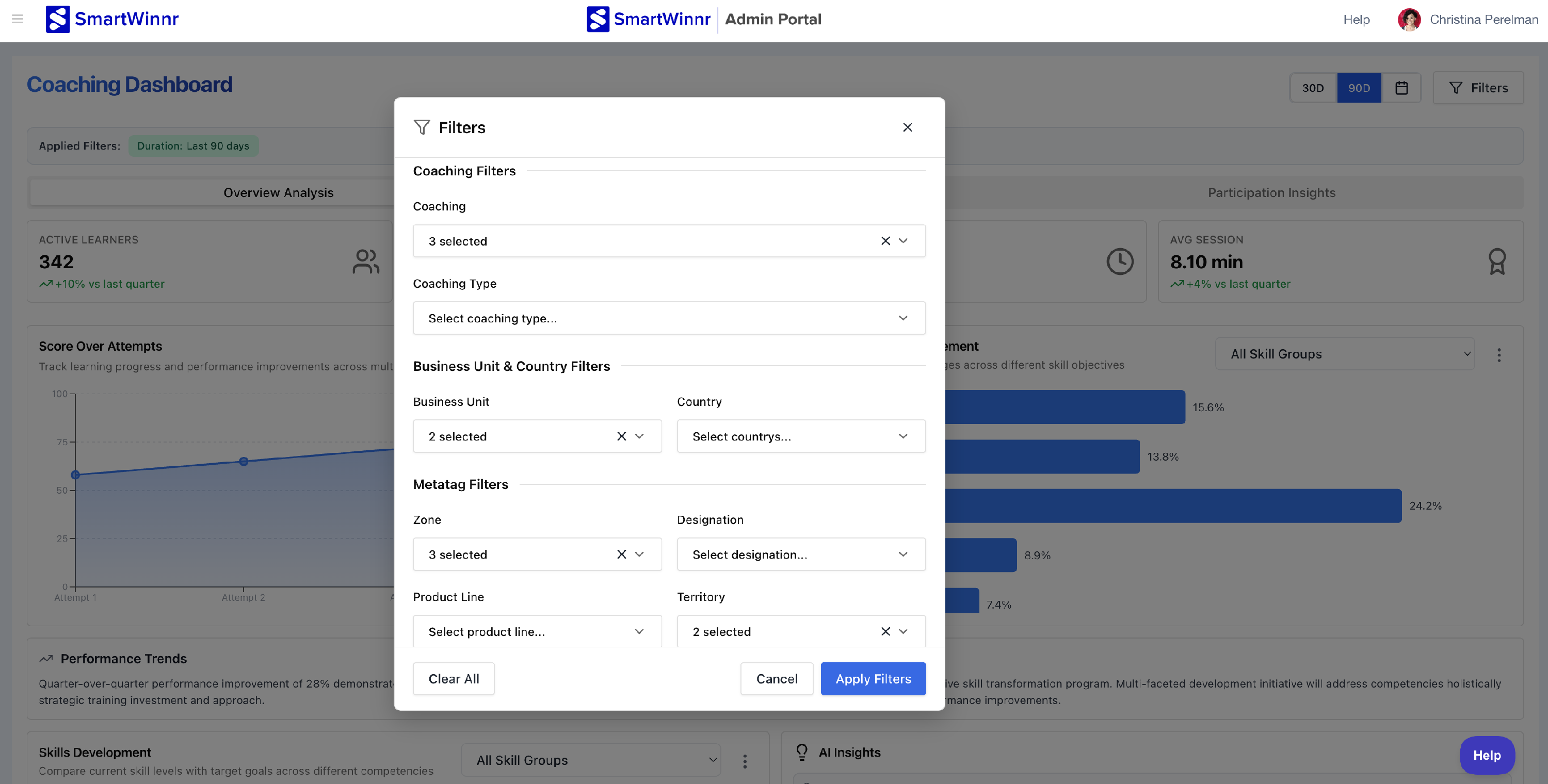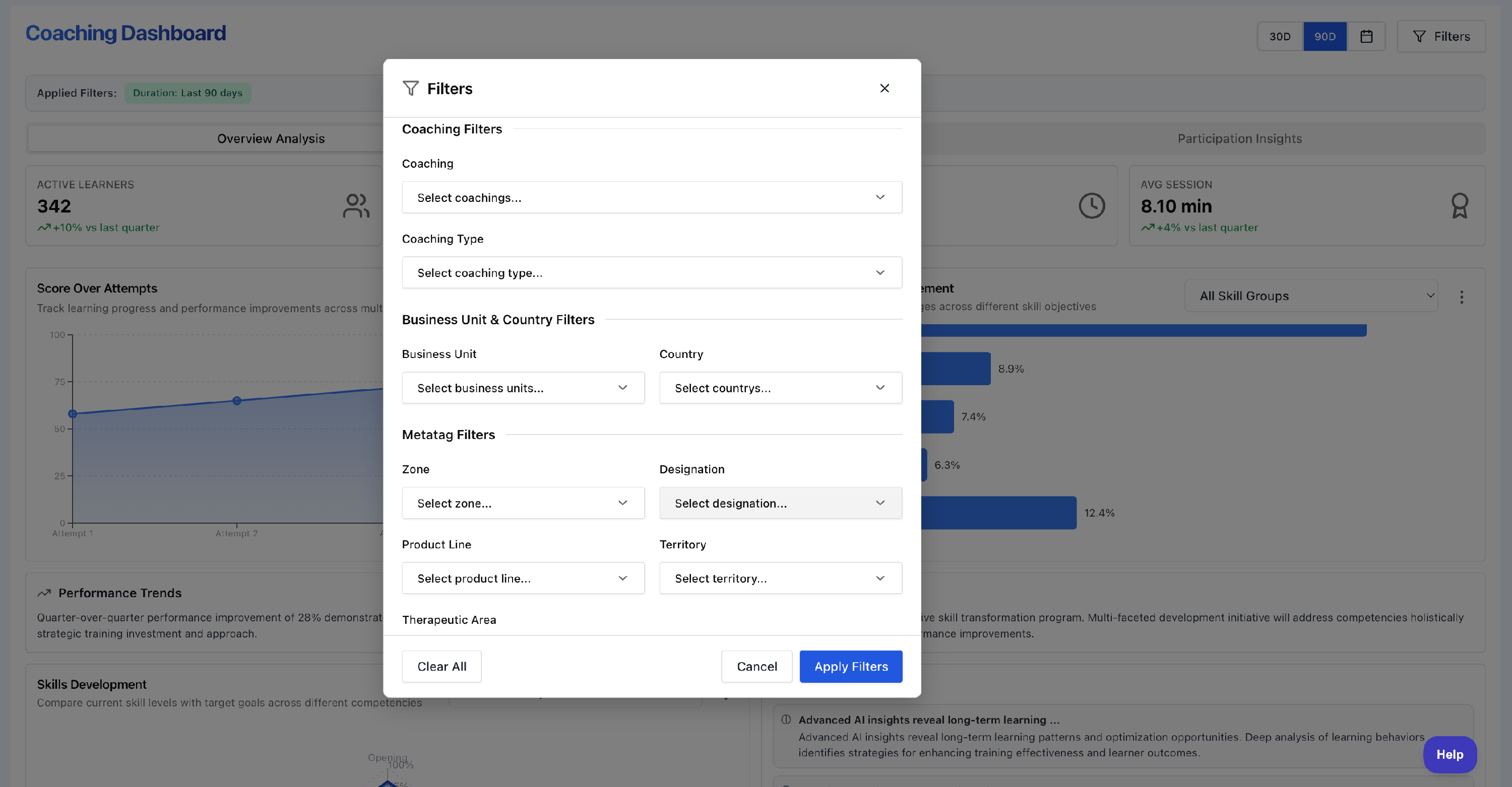 Beyond selecting multiple coachings, the Filters panel offers several other ways to customize your dashboard view. You can use these filters individually or combine them to drill down into specific segments of your data.