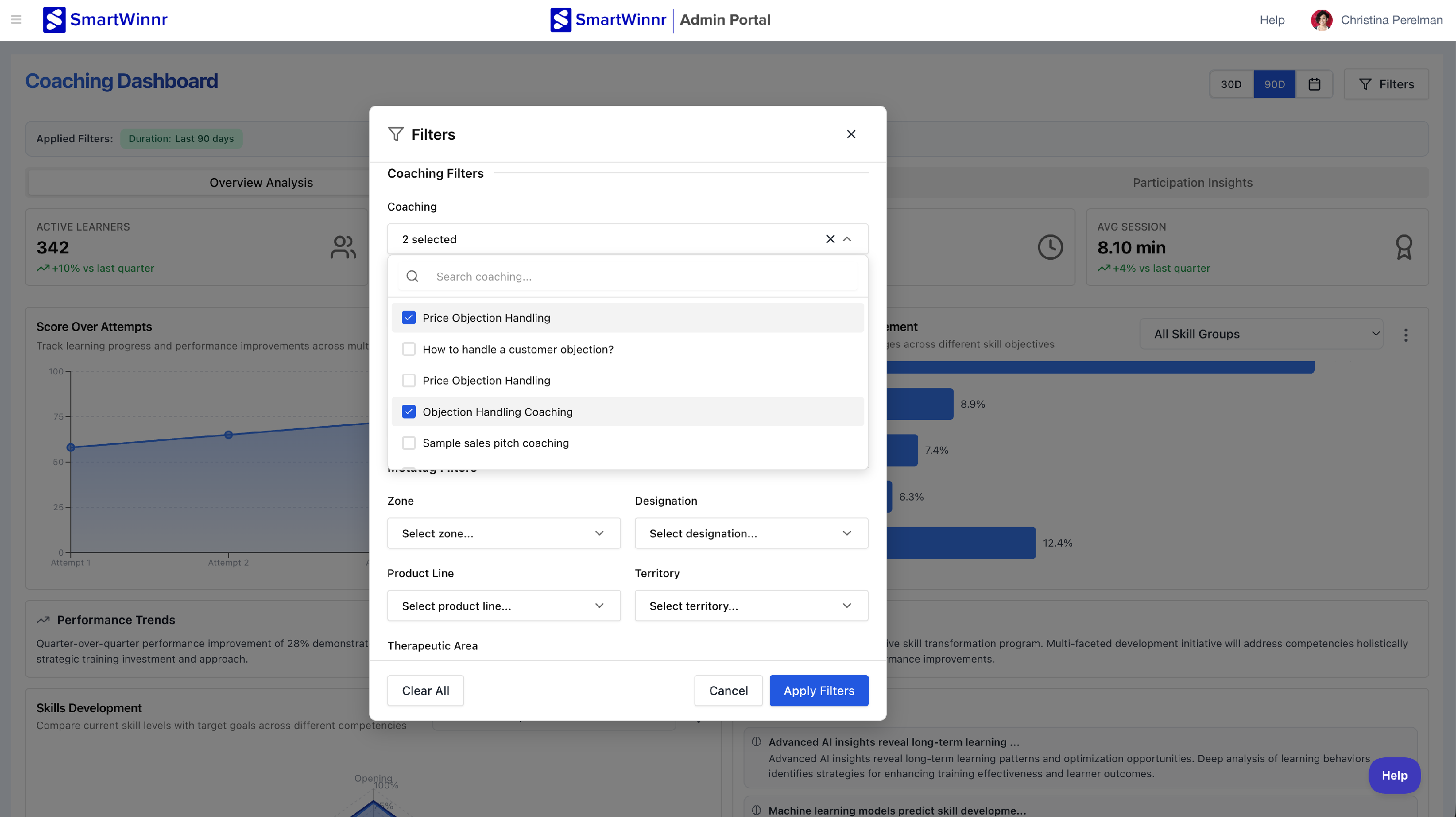 You can track improvement across multiple roleplays simultaneously by using the Filters feature on the Coaching Dashboard. This allows you to view combined performance data for any selection of coachings you choose.