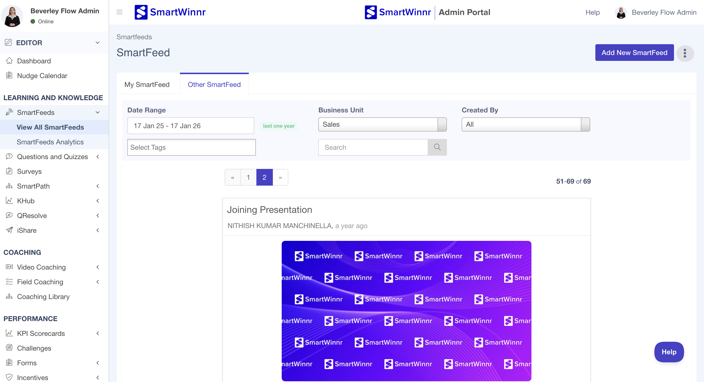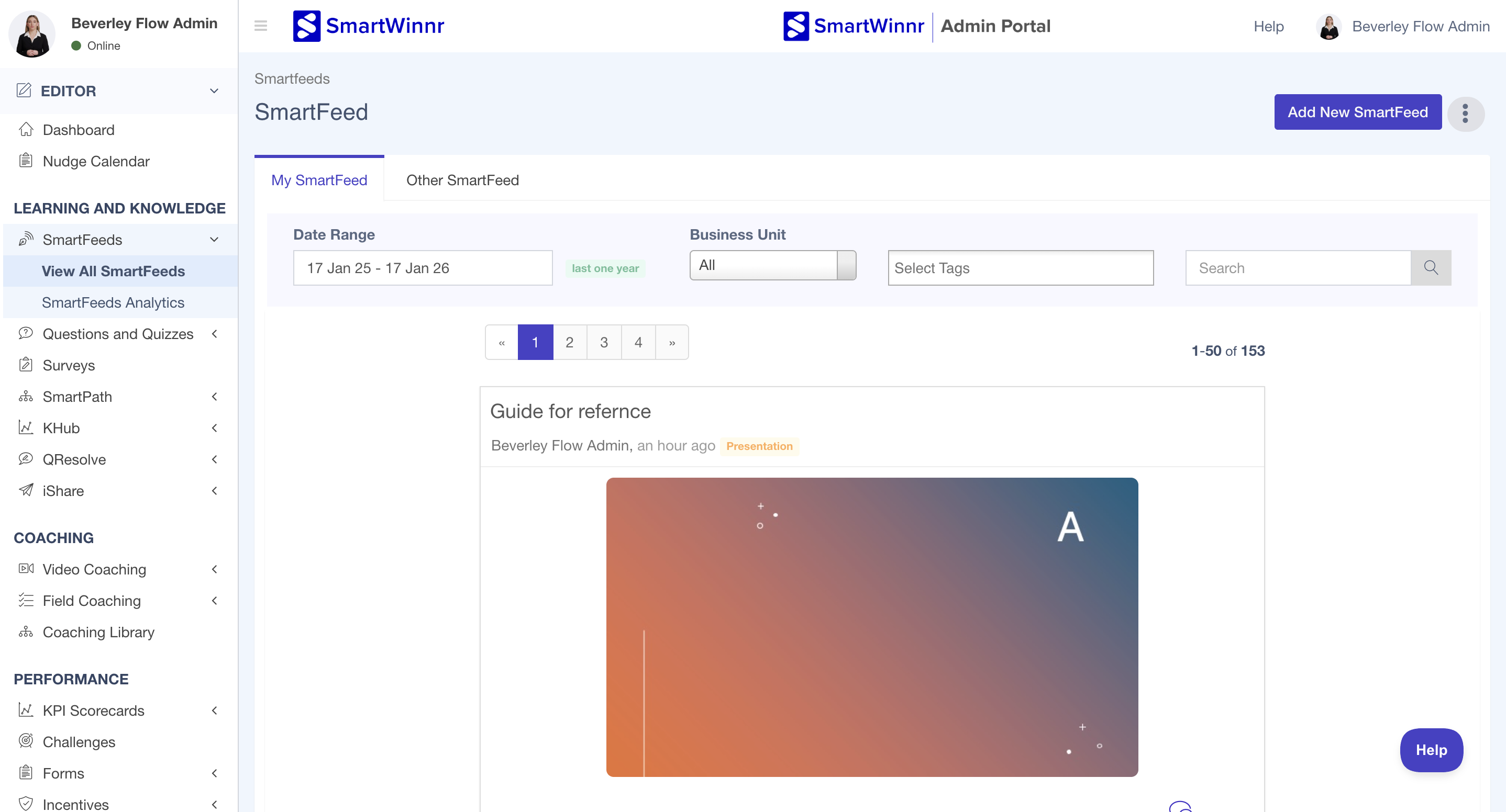 SmartWinnr allows editors to view all SmartFeeds that they have created, as well as SmartFeeds created by other editors to which they have access. This helps you manage, review, and reuse SmartFeeds efficiently.