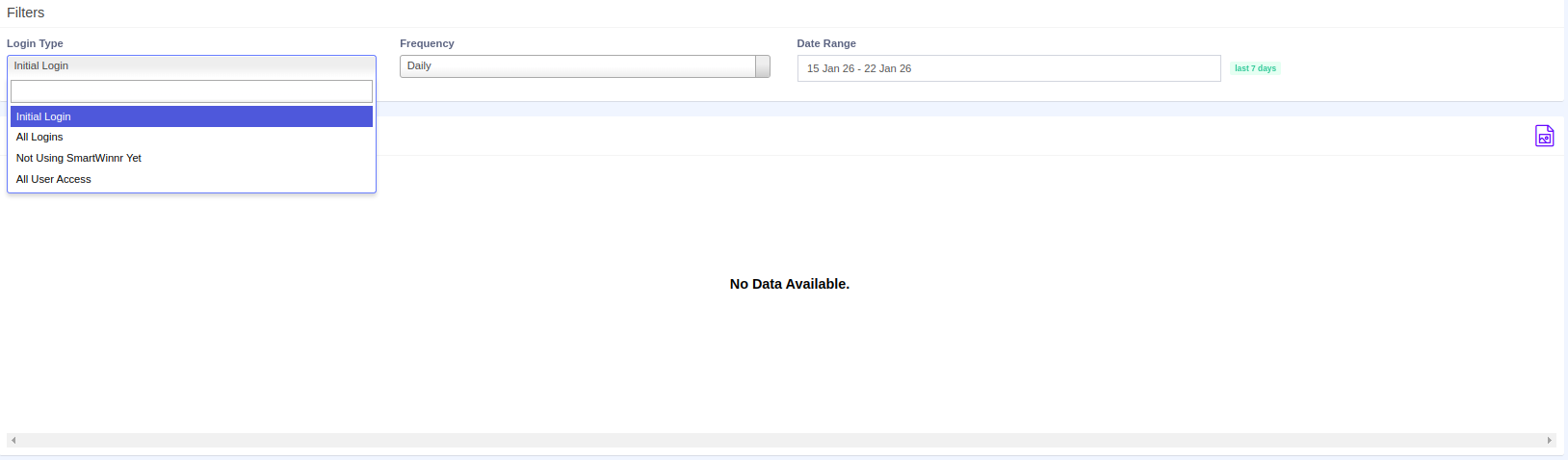 - Click Download All Login Report by Date to download a report that shows the number of logins for the selected date range, grouped based on the chosen frequency. Here, the number of logins for a 1-year date range is shown below. The logins are grouped based on a weekly frequency. For example, the total number of logins in the first week of January is 16.