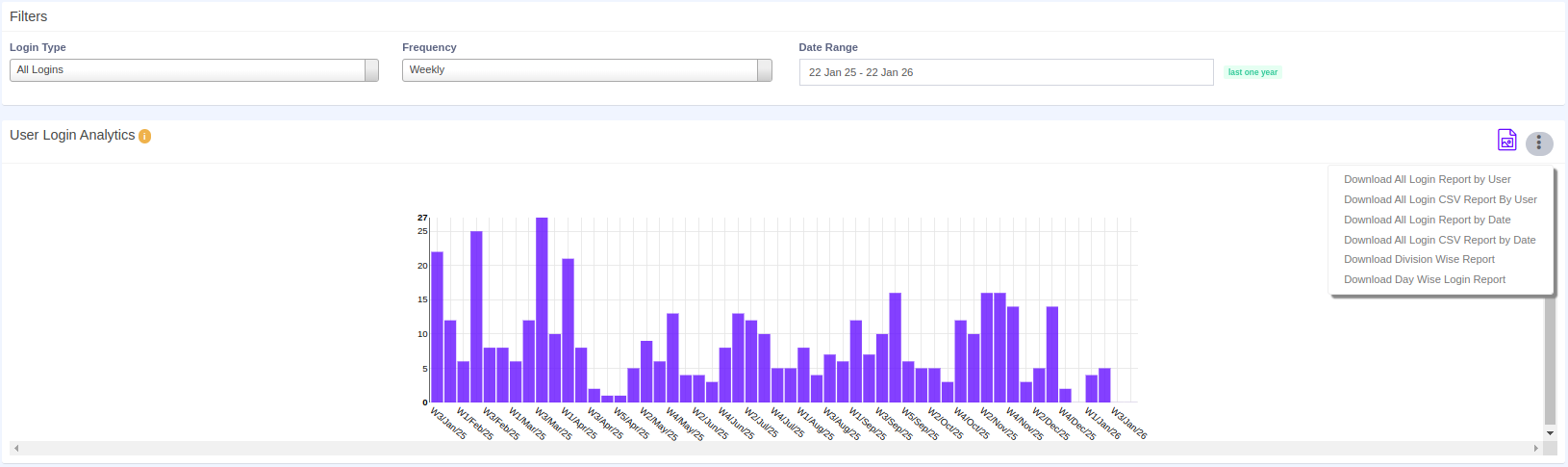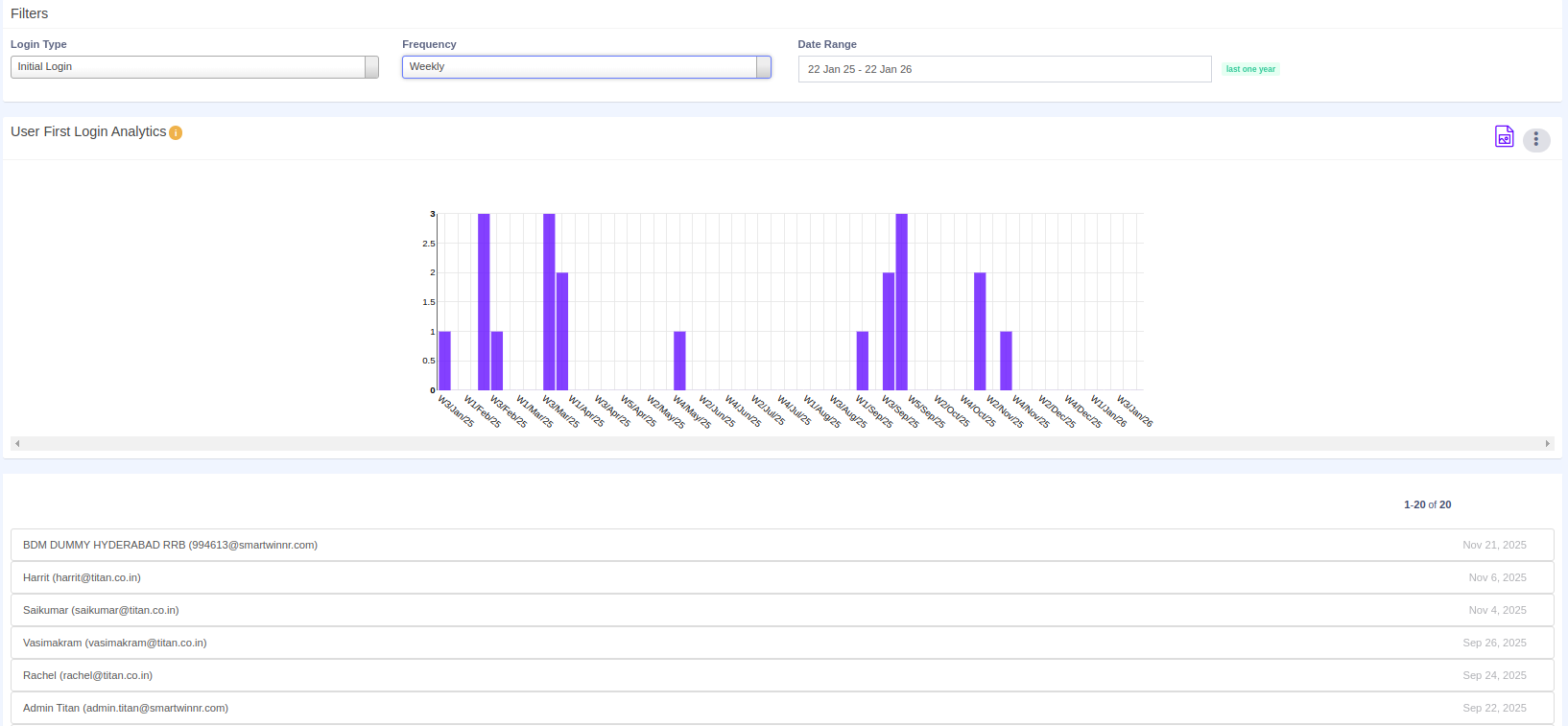 Example: The screenshot below shows the User First Login Analytics for the date range 22 Jan 2025 to 22 Jan 2026, with the frequency set to Weekly. It lists the number of users who have logged in for the first time in the selected date range.