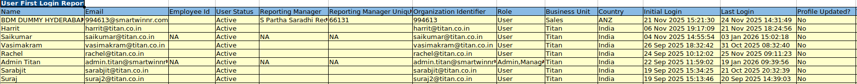 Below is a sample Initial Login Report that displays user profile details along with the date and time of their first login. The report also includes the date and time of the user’s most recent login.