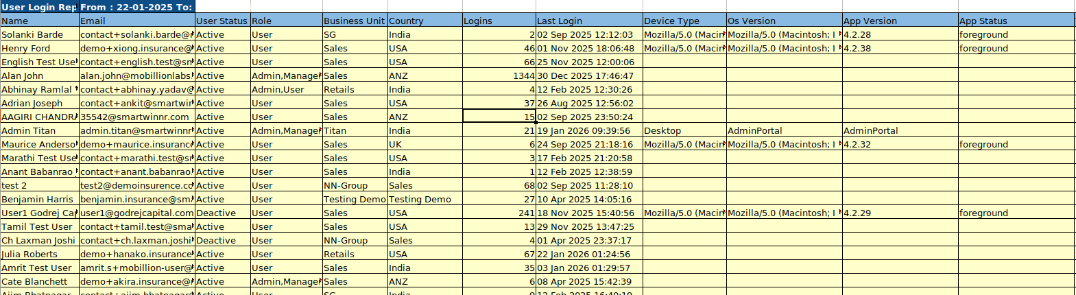 - Click Download All Login Report by User to download the login report in Excel format. This report provides the profile details of each user who logged in to the system within the selected date range, along with the total number of logins(Column Logins). It also includes details such as the device type, OS version, app version, and app status used by the user.