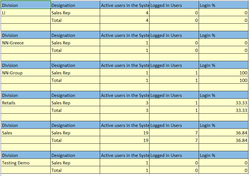 The following report will be downloaded. This report shows the total number of active users in the system under the selected metatag, the number of users who logged in from this category, and the corresponding login percentage.