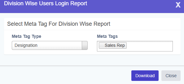 - Click Download Division-Wise Report to download the division-wise report for the selected date range and frequency. A pop-up window will appear, allowing you to select the required division metatags. Only users associated with the selected metatags will be included in the report. Click Download to download the report.