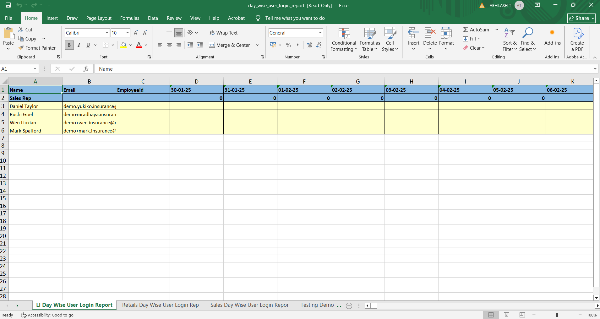 The following report will be downloaded. This report gives the division-wise report on user login for each day in the given date range. Below given is the sheet for the division "LI".