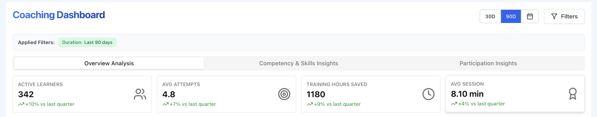 - Review Active Learners and Avg Attempts weekly to catch engagement issues early