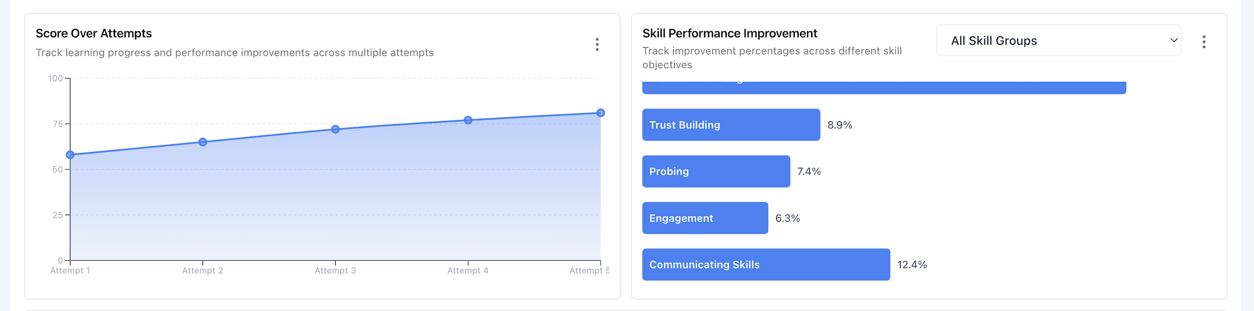 What the percentages mean: If "Communicating Skills" shows 12.4%, this means that on average, learners improved their communicating skills scores by 12.4% from their first attempt to their most recent attempt.