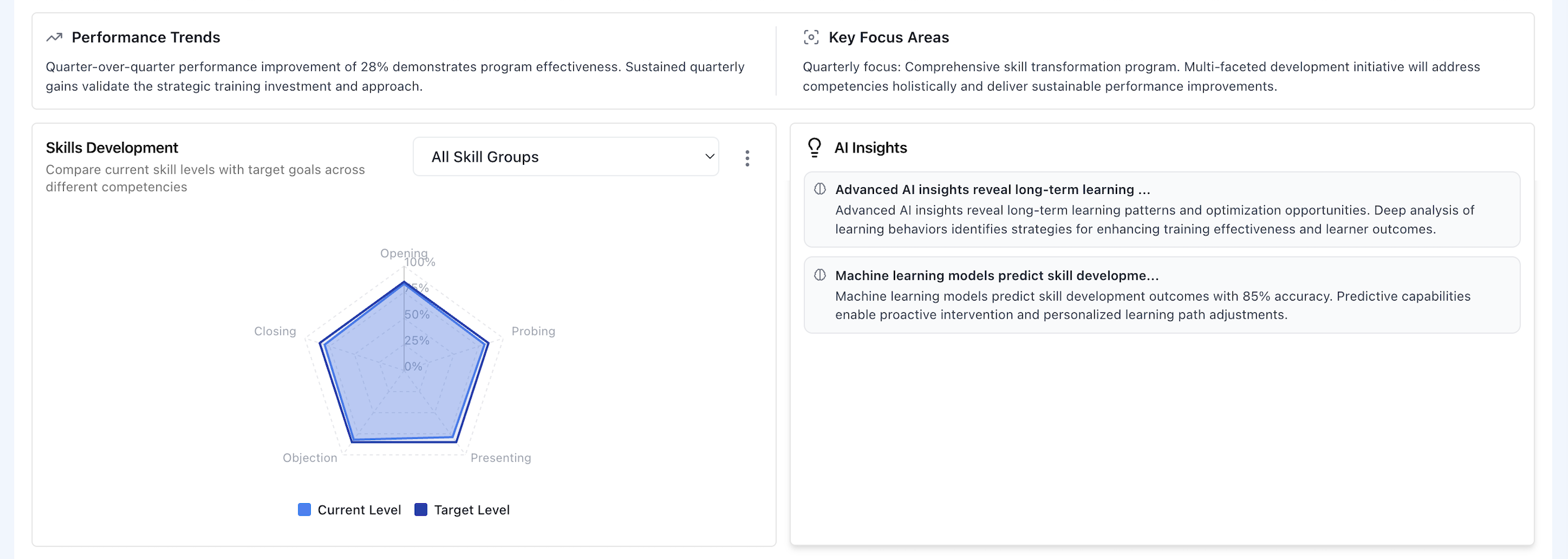 What it includes: A text summary highlighting key trends in quarter-over-quarter performance, program effectiveness, and skill development patterns.