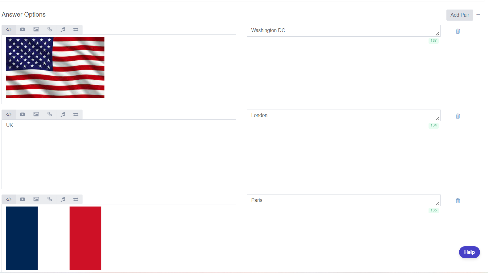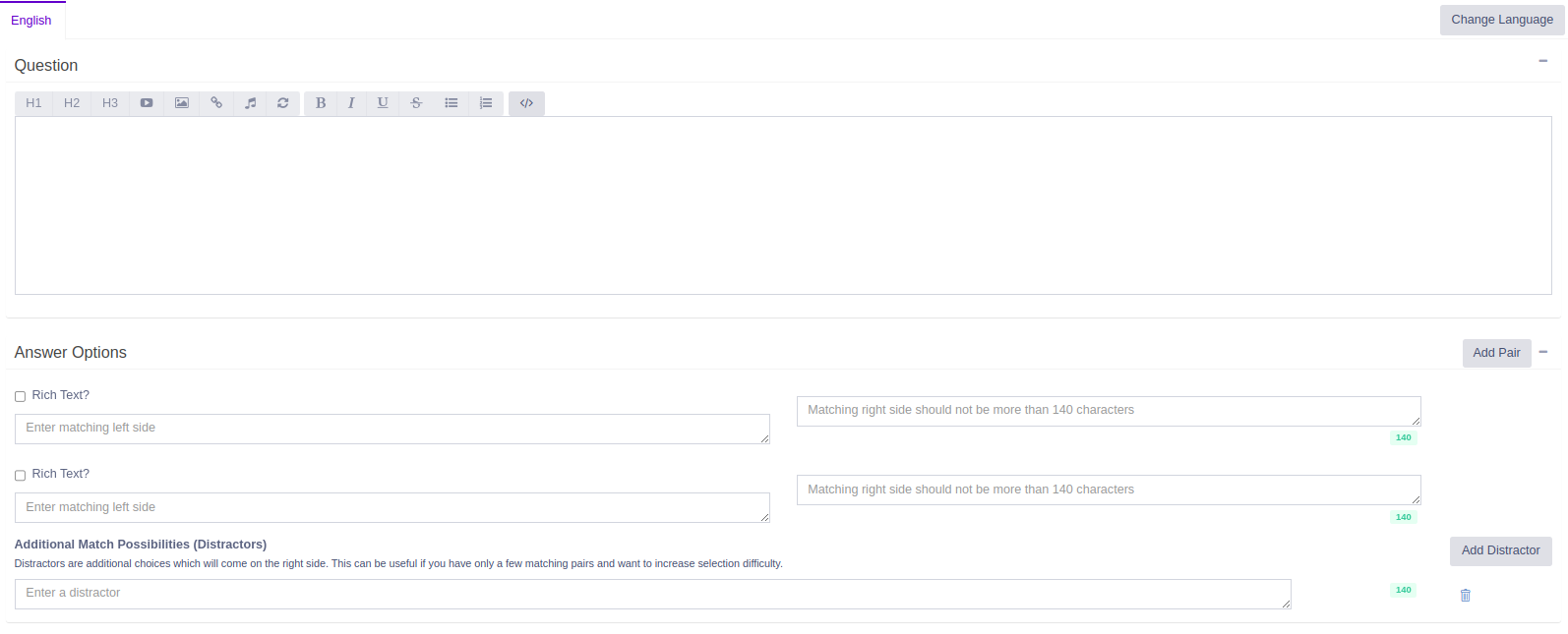 Add the left-hand side with an Answer Options as a text, image, video, or audio. By clicking on the Rich Text checkbox, you will be able to add video, audio etc as answer options. Then, add the match element on the right-hand side section. Distractors allow you to add additional answer choices that will come on the right side. This can be useful if you have only a few matching pairs and want to increase selection difficulty.