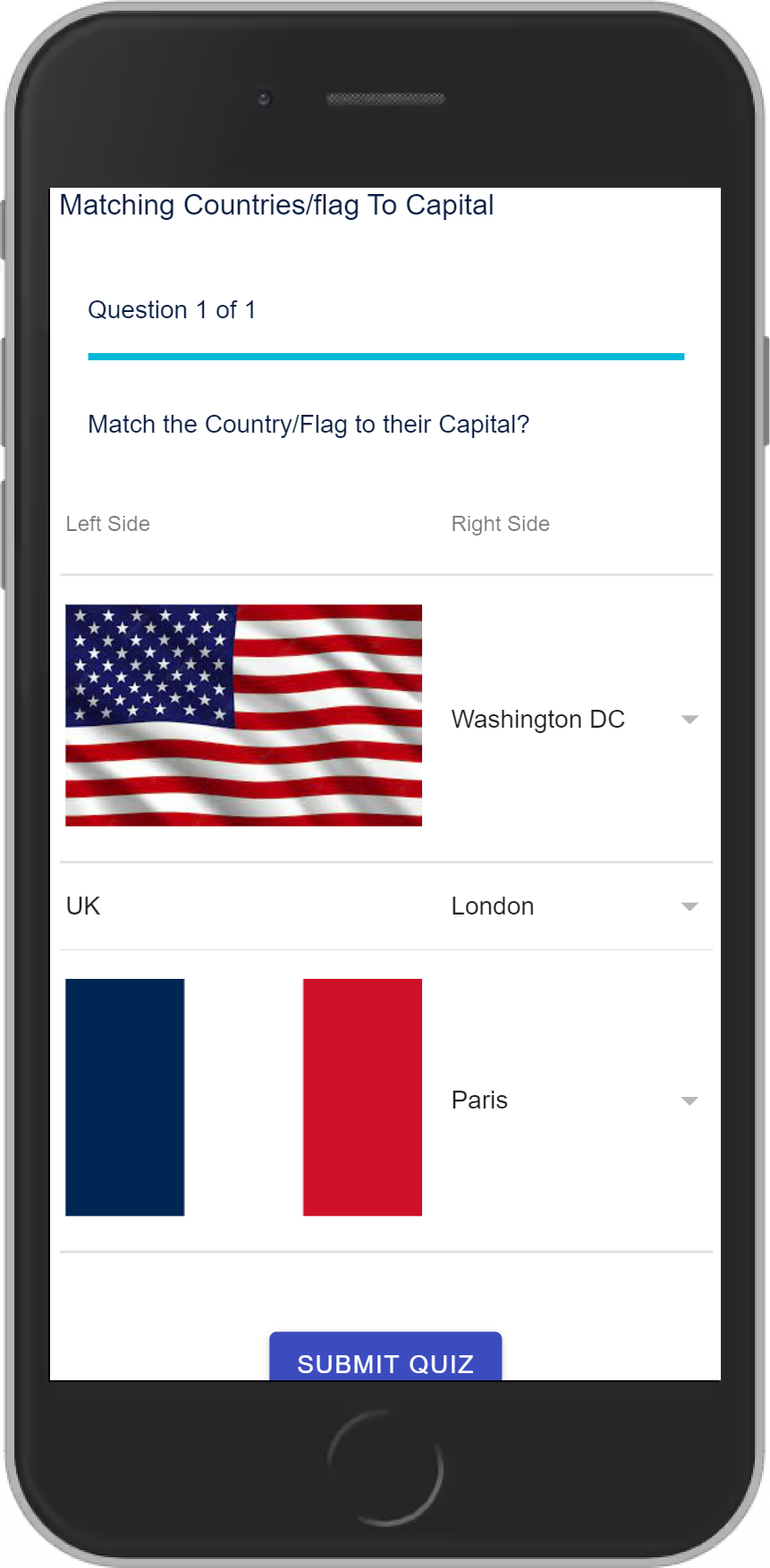 Once the matching question is created and shared with participants, it will appear on their mobile application in an interactive format. The right-hand options are displayed as drop-down menus, which remain consistent across all items.
