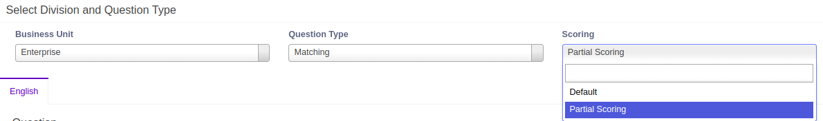 On the 'Create new Question' select the 'Question Type' as ‘Matching’. Also, select the scoring, whether default or partial. Use Default Scoring when the question has only one correct answer. Use Partial Scoring when the question has multiple correct answers. In Partial Scoring, the total score is distributed equally among all correct answer options.