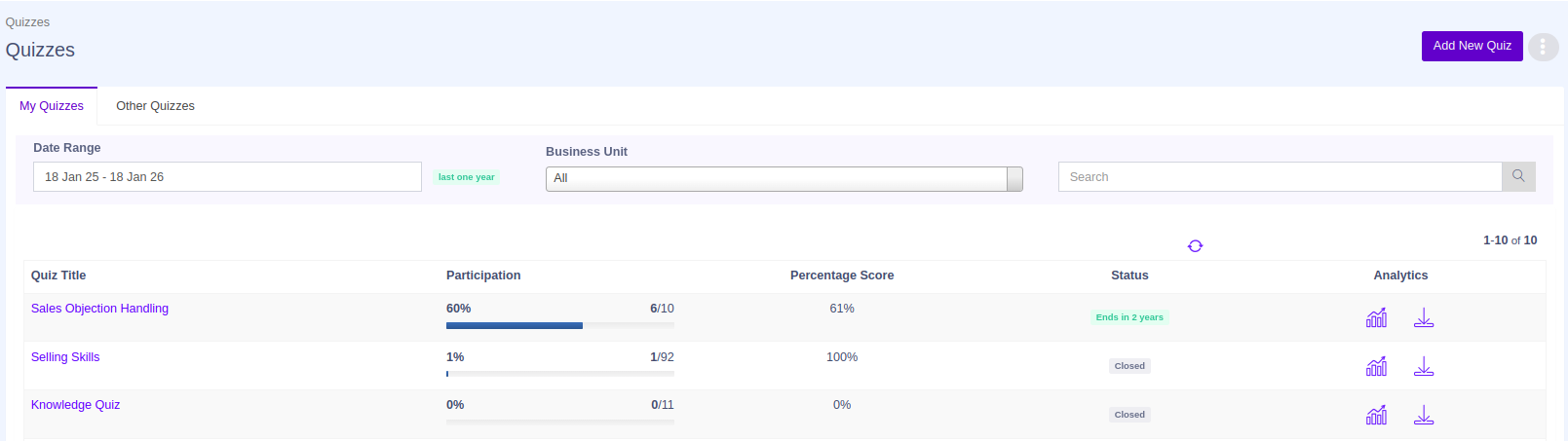 - Participation – The overall participation percentage along with actual numbers. For example, in the screenshot, it shows that the participation for the quiz 'Sales Objection Handling' till now is 60%, with 6 person out of 10 have taken the quiz.