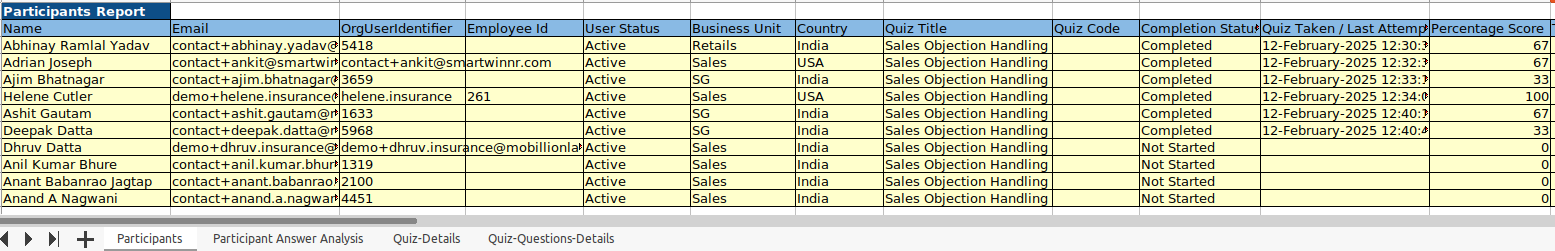 This report will show the participation of the users in the quiz, whether they participated or not; it will also provide the quiz score of the participants.