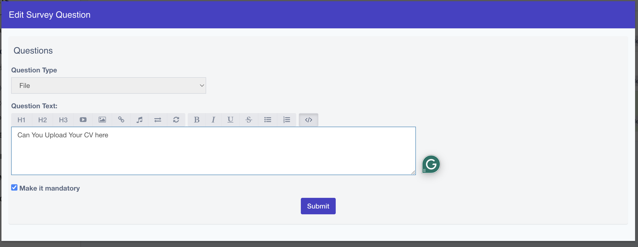 The File Question Type allows respondents to upload a file as their answer to a question. This is useful when you need participants to submit supporting documents or evidence instead of selecting or typing a response