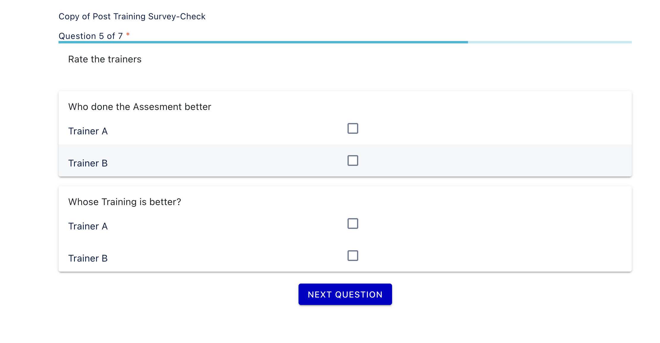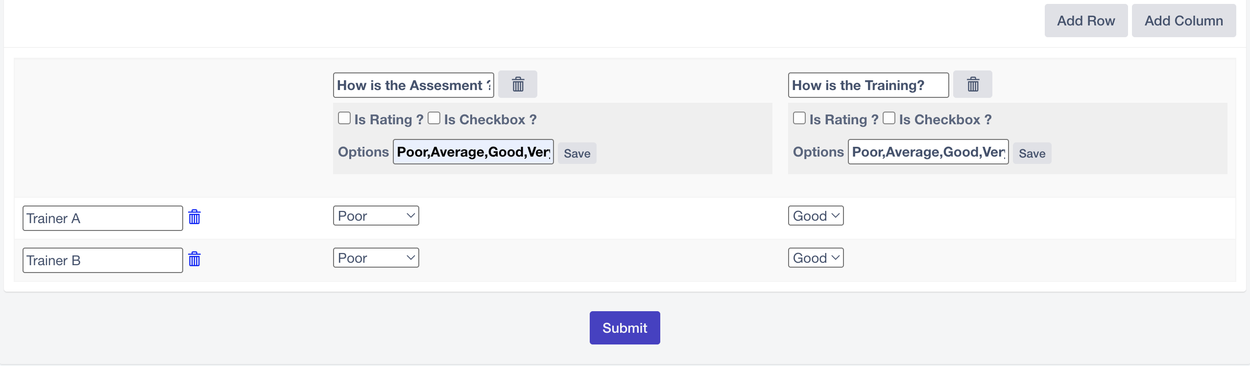 In a Matrix question, SmartWinnr provides two display options to define how the answer choices appear. One of these options is Rating and Checkbox.