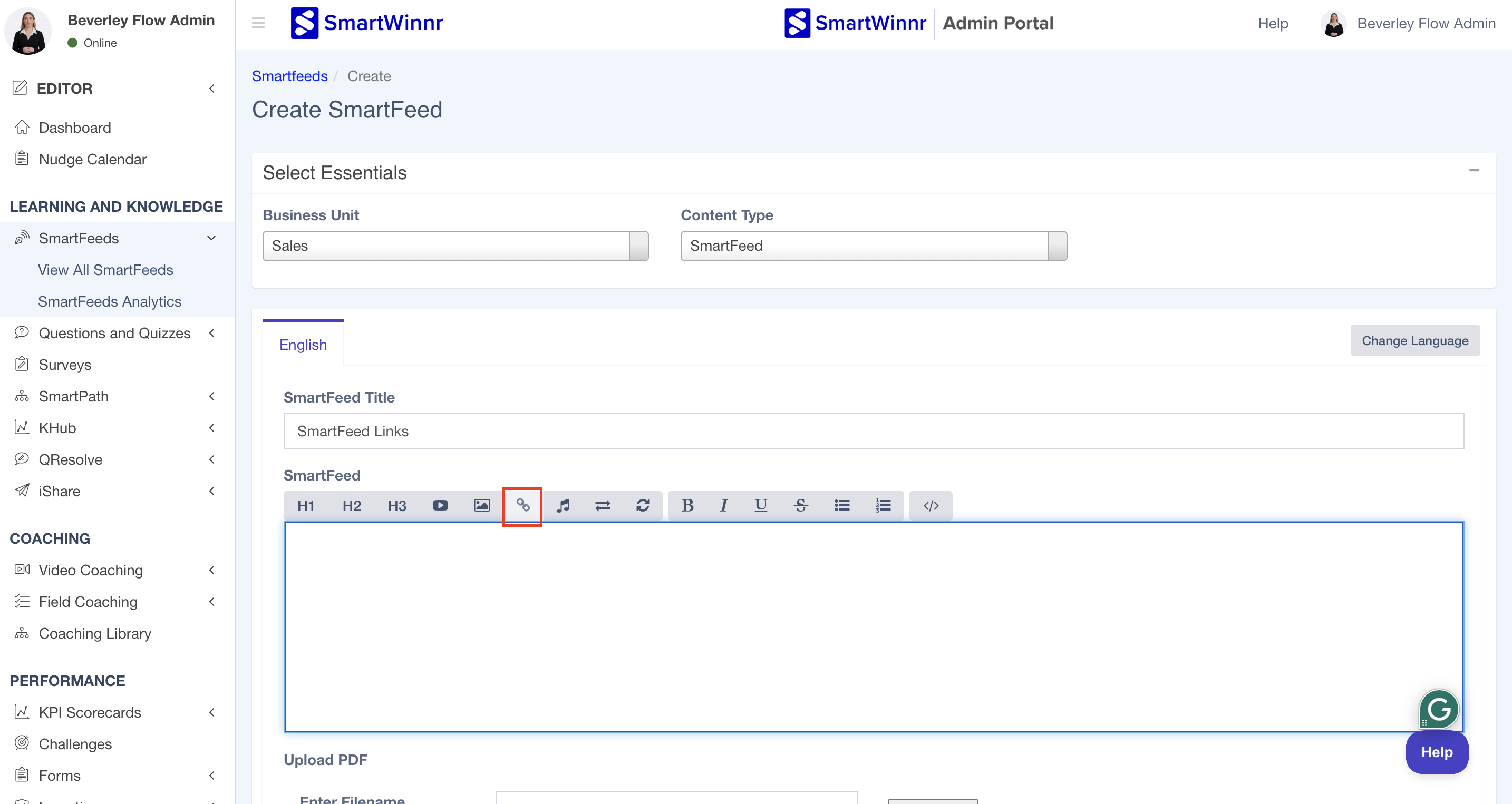 Click on the link icon to attach an external link to your SmartFeed or to the question that you create in SmartWinnr. You can add links from DropBox and Box or any other external links as content.