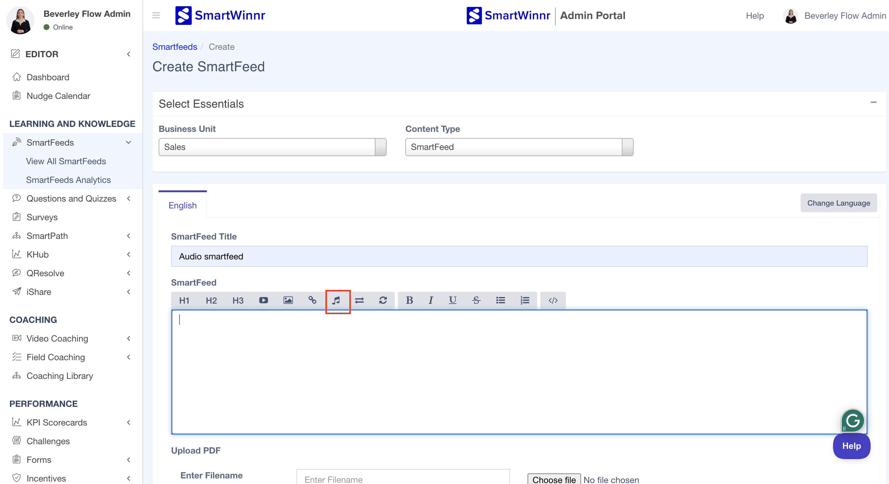 Click on the audio icon to attach the audio file to your SmartFeed or to the question that you create in SmartWinnr.